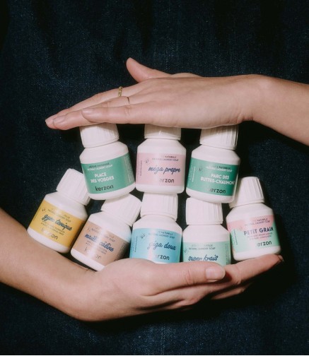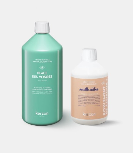 Designed for your entire wardrobe, our new duo combines: Maille Câline—a dedicated companion for delicate fibers and your most precious wools, powered by cottonseed extract—with a bottle of your favorite multi-tasking laundry soap.