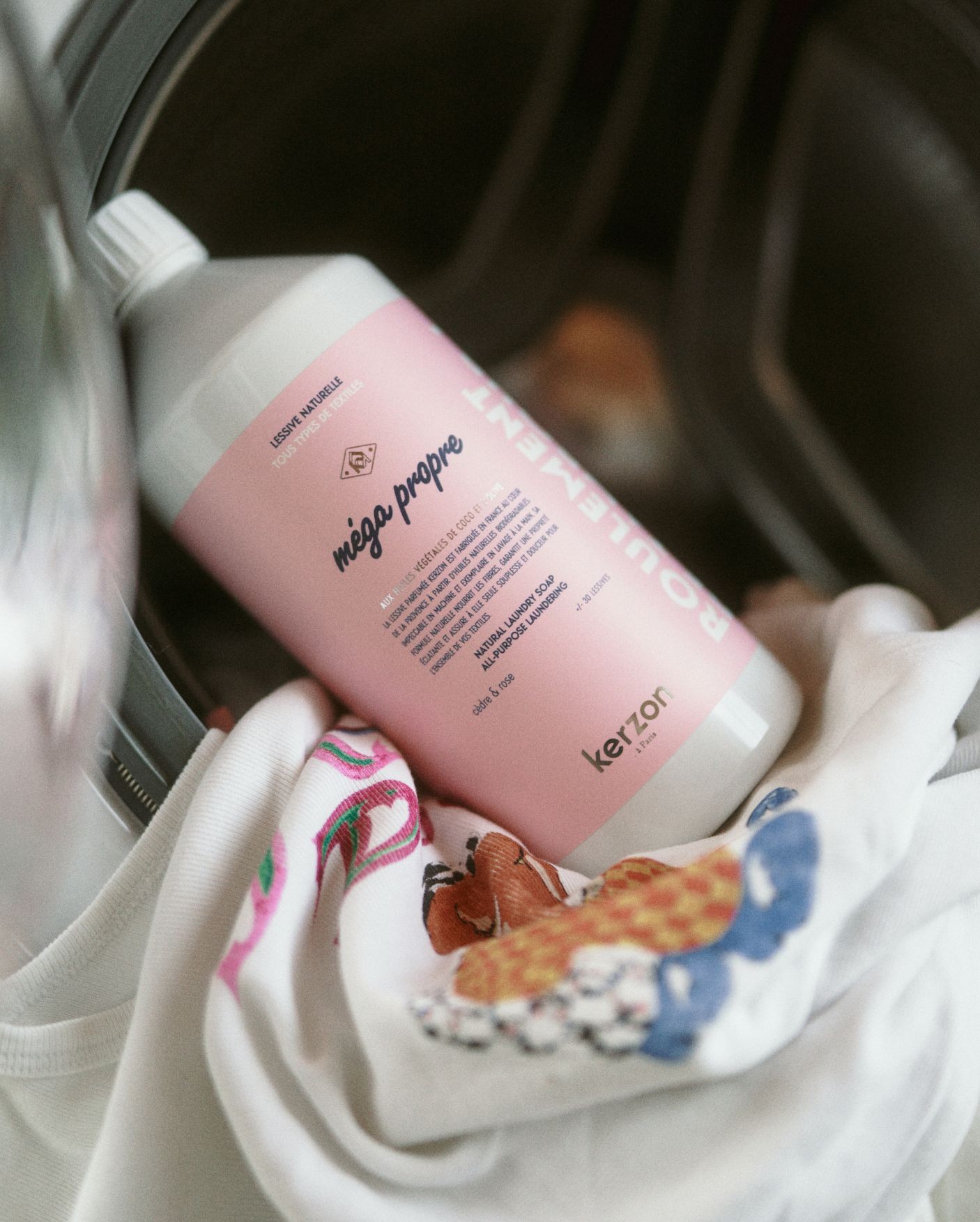 Inspired by the memory of the perfume of laundromats and the special scent of dry cleaning, Méga Propre fragrance offers powdery top notes with a rose floral heart, and a shade of lightly amber cedar.