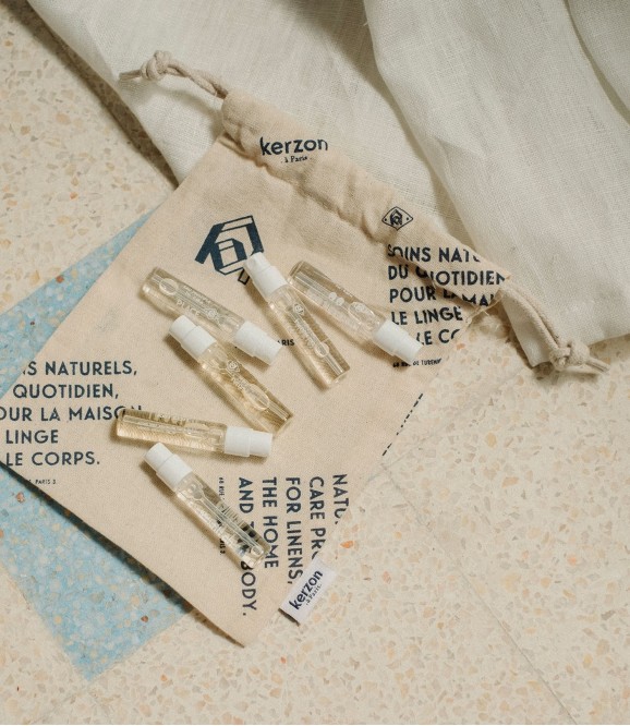 Discover our eaux de toilette with this discovery set containing 9 x 2ml samples: Maille Câline, Petit Grain, Super Frais, Méga Propre, Giga Doux, Gym Tonique, La Tour Eiffel and Parc des Buttes-Chaumont — all tucked into our small organic cotton pouch.