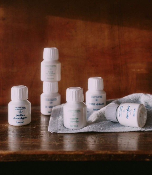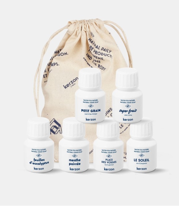 Test our fragranced natural liquid soaps with this discovery set containing six doses: Feuilles d'Eucalyptus, Menthe Poivrée, Place des Vosges, Le Soleil, Super Frais and Petit Grain, in an organic cotton bag. It’s a game changer, find your favorite one!