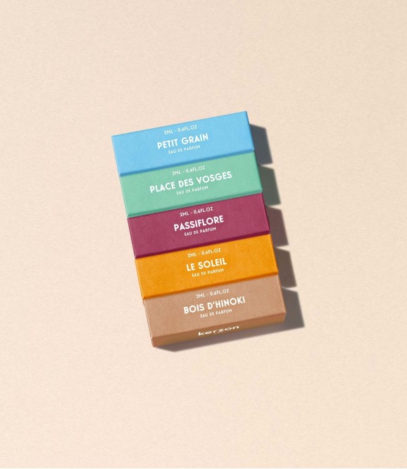 Discover our eaux de parfum collection with this discovery set containing 5 doses 0.6fl.oz: Bois d'Hinoki, Le Soleil, Passiflore, Petit Grain et Place des Vosges. Inspired by the infinite richness of nature, Kerzon eaux de parfum invite you on a unique olfactory journey, exploring delicate petals, woody bark, sun-kissed fruit and aromatic herbs.