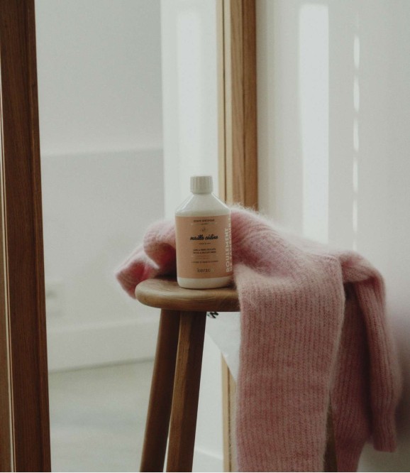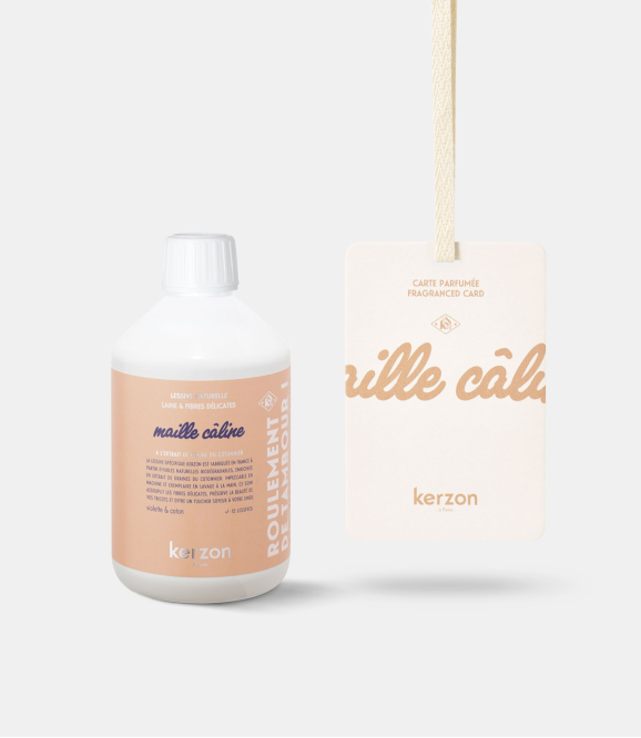 Care for your laundry with the Maille Câline duo, featuring a specific laundry soap and a fragranced card. The laundry soap gently cleans while leaving a lasting fragrance, while the card extends the experience by scenting your drawers, wardrobes, and closets with your favorite Kerzon notes. A simple, elegant gesture to enhance the fragrance trail.