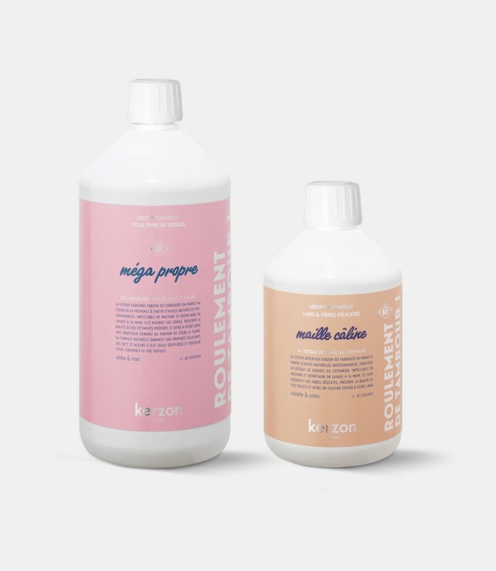 The ideal duo for impeccably clean laundry every day, combining softness and effectiveness. One bottle of Maille Câline laundry soap, designed to care for your delicate fabrics—cashmere, wool, lace, and silk—thanks to cottonseed extract, paired with one bottle of your beloved multi-purpose laundry soap to deliver highly effective cleaning, remove stubborn stains, and preserve the colors and softness of your everyday laundry.