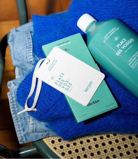 Care for your laundry with the Place des Vosges duo, featuring a natural laundry soap and a fragranced card. The laundry soap gently cleans while leaving a lasting fragrance, while the card extends the experience by scenting your drawers, wardrobes, and closets with your favorite Kerzon notes. A simple, elegant gesture to enhance the fragrance trail.